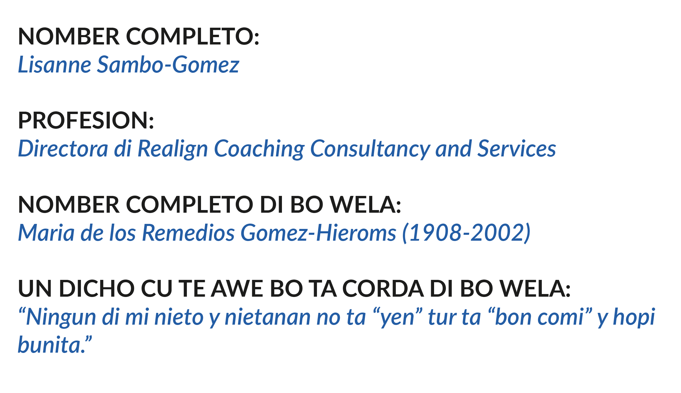 “Un recuerdo bunita cumi tin ta cu e ultimo biaha cu mi a wak mi wela (net 1 ora prome mi a subi avion pa bay Hulanda pa bai studia) mi tabata sinta bandi dje den e cas di un di mi Tionan (cu por sierto awor ta mi cas). Ya e tabatin añanan cu e no tabata reconoce hende mas. Mi tabata papia cune y e ora di despedi a yega, mi tabatin hopi dificultad pa cu esaki y lagrima tabata basha for di mi wowo. Mi a wak e den su cara y a bise: Dudu te oro, Dudu sa ta ken? E la keda wak mi den mi cara y mi a eigenlijk expect e no bisa nada, ora e la bisami: “Ma ta claro mi sa cu t’abo Lisanne, mi nieta bunita” y den un seconde e tabata leu atrobe. Esei tabata su despedida na ami, semper agradecido pa e momento ey cu mi lo tene cumi pa semper.”