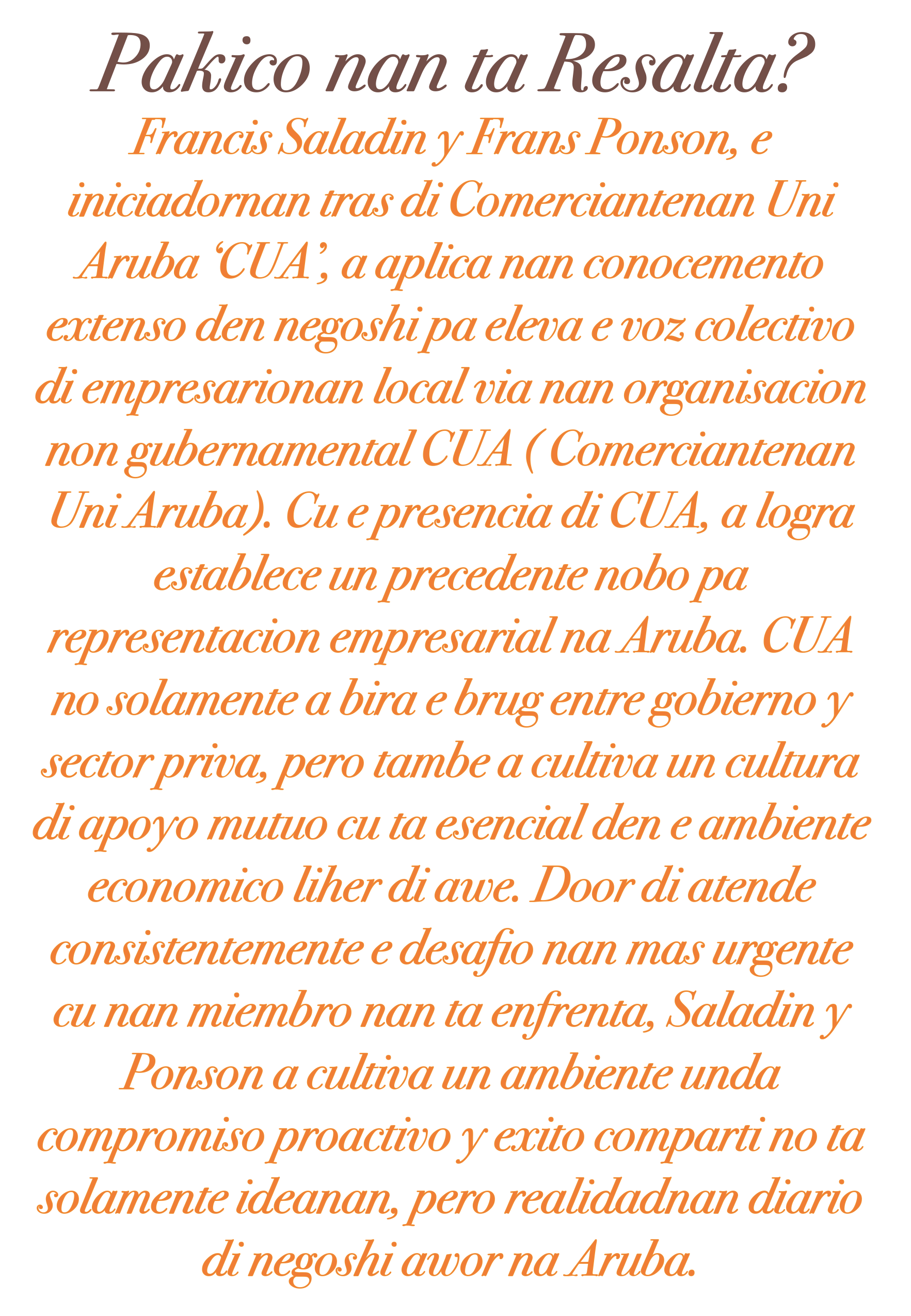 "Nos logro di mas grando toch ta e abilidad pa trece comerciantenan hunto y traha cambionan real cu ta beneficia tanto e comunidad di empresarionan como gobierno y Aruba den su totalidad. Nos ta un organisacion cu ta enfoca riba e bienestar economico di nos comunidad y ta percura pa nan bienestar di un manera holistico. E mescla di argumentacion, educacion, colaboracion y e dedicacion pa trece solucionnan practico ta un refleho di nos exito mas grandi.”