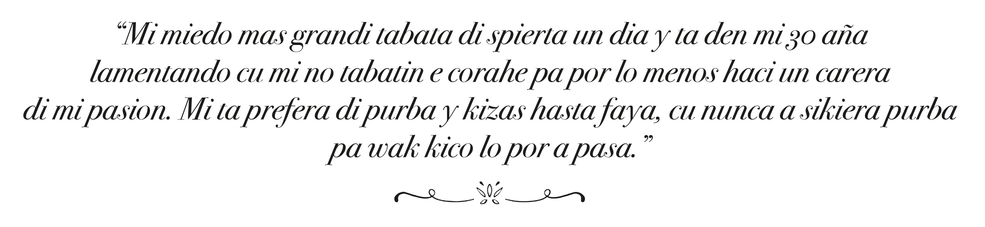 "Acumula asina hopi experiencia y conocemento posibel, y nunca stop di siña. Purba haci loke bo ta stima como un pasa tempo, y si e pasion ainda t’ey, e lo ta bale la pena pa duna esaki un chens," Sigui bo pasion.”