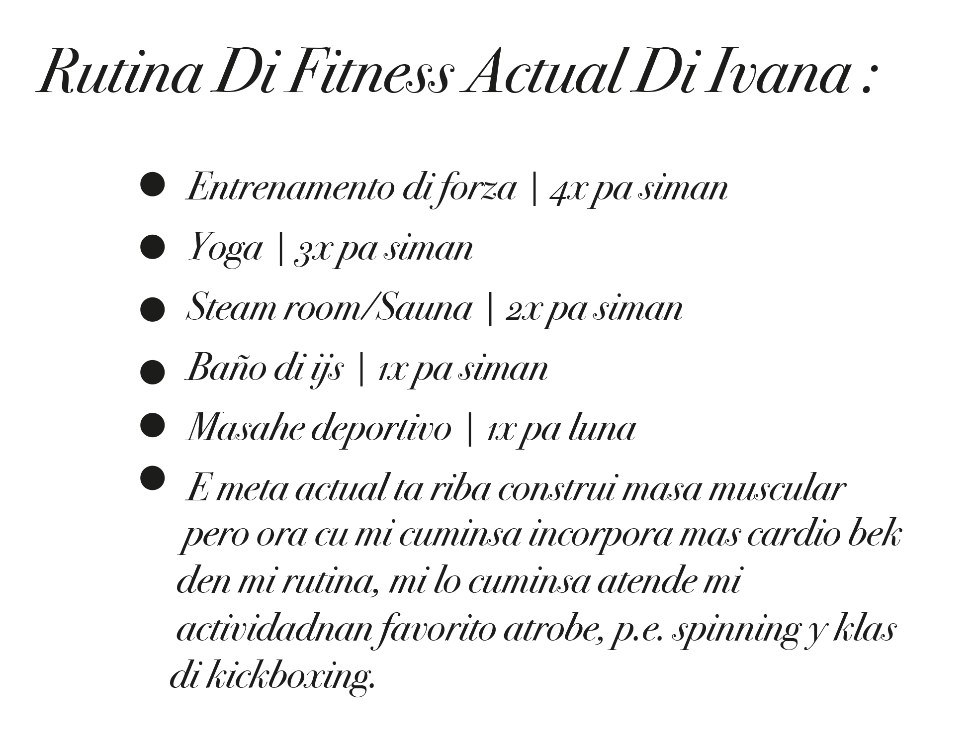 “Mi crecemento personal ta enorme desde cu mi a cuminsa cu mi trayectoria di fitness, cu mi transformacion fisico variando anualmente. Cada aña, mi ta cambia mi estilo di entrenamento y e persona nan cu mi ta entrena cu nan, dunando mi experiencia nan di aprendisahe practico cu ta complementa mi conocemento. Importante ta pa mi entrenamento nan ta semper ta alinea cu mi meta nan personal di fitnes pa mi por disfruta di esaki y e por ta sostenibel y beneficioso. Tempo cu mi a muda pa Merca, esaki a pone presion inicialmente riba mi salud mental. Sin embargo, door di establece habitonan clave di bida enfoca rond di salud, mi a bira mas fuerte mentalmente. Mi a gana confiansa den mi mes, a reconoce mi potencial, y a desaroya un vision mas cla pa mi futuro.”