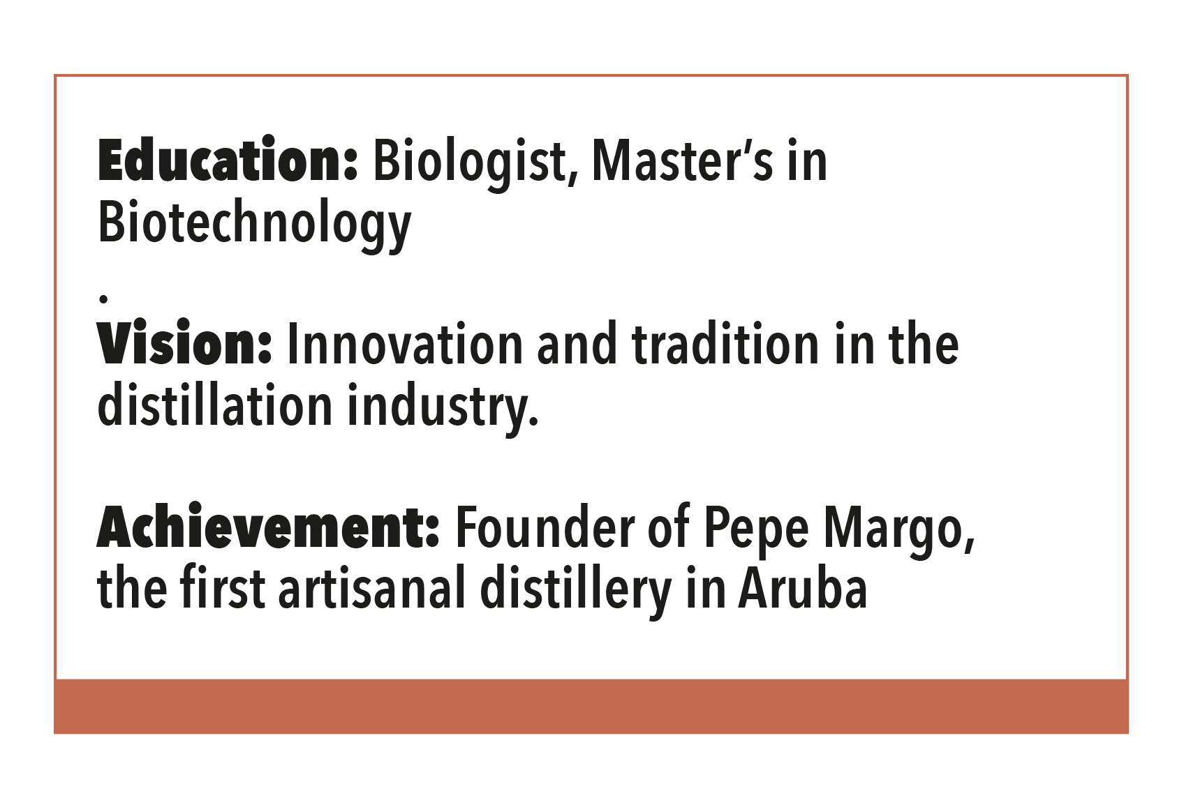 "With an academic background in biology and biotechnology, Jonathan Harms felt a calling to create something unique and genuinely Aruban. Inspired by his family's background in alcohol importation (Romar Trading), Jonathan embarked on his entrepreneurial journey. 'His desire to honor his heritage and combine it with his scientific passion gave birth to Pepe Margo Distillery. He started the conversation with his father, Milton Harms. "Together with my father, we visited several distilleries, and that's where the idea started to brew. We began to work it out, brainstorm, and eventually, more and more people got involved to contribute to this great idea.'"