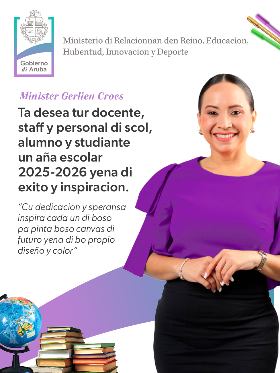 E responsabilidad ta mescos pa mucha muher y mucha homber. Tur dos mester wordo trata cu respet. Nan mester trata otro cu respet tambe. Mester tene cuenta un e privacidad di cada alumno. Una bes un alumno sea ta homber of muhe haya confiansa cu bo, bo mester ta cla tambe pa nan ‘open up’ cubo di tur tema, como adulto bo mester sa bo limite di te na unda bo ta hiba e conversacion, mantene e enfoke semper riba duna consehonan husto na bienestar di e studiante y si bo ripara cu e studiante mester ayudo externo of cu mester aserca su mayornan, ami semper ta avisa e studiante prome p’asina mi no kibra e confiansa cune, pasobra tin biaha, maske e ta un secreto, mester convence e studiante pa toch conta su mayornan of un hende externo, pero nunca haci esaki tras di e studiante su lomba.”