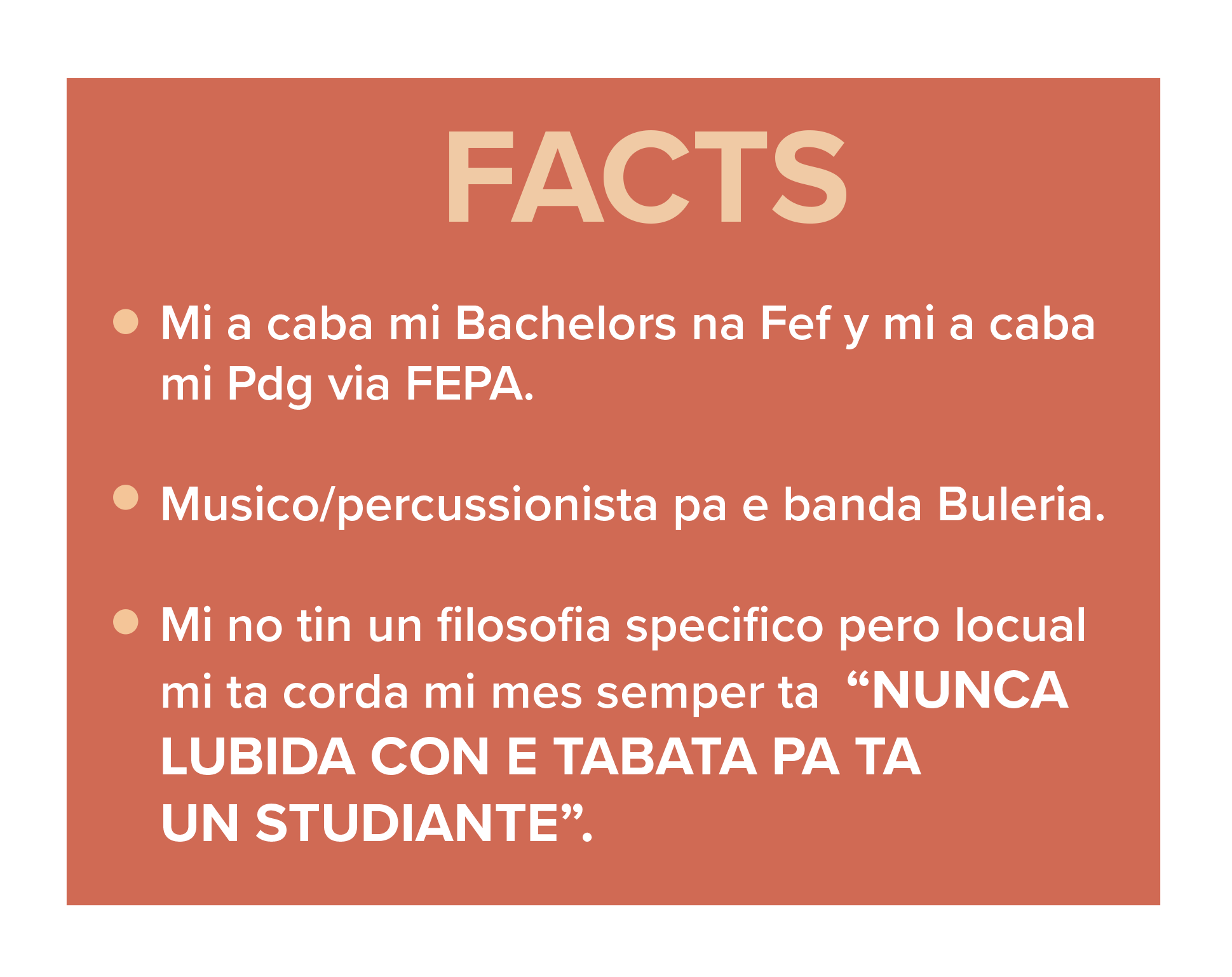 Bon personalidad y un caracter firme ta fundamental pa un docente. E mester tin pasenshi, mustra respet pa haya respet, y domina habilidadnan comunicativo cu studiantenan, mayornan y coleganan. Como docente bo ta deal cu alumnonan cu diferente caracter y background. “Respet y empatia ta base pa crea confianza den klas.”